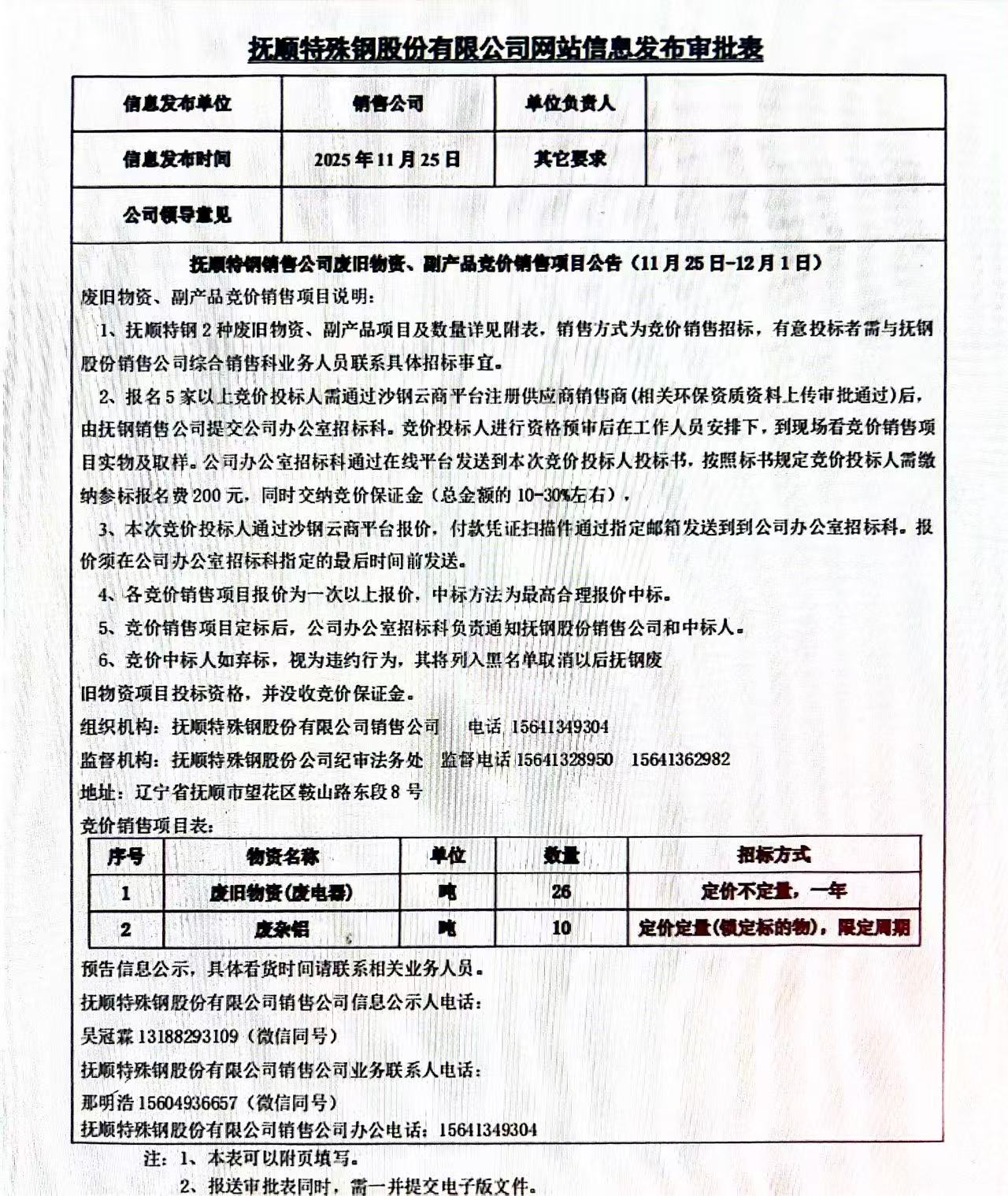 撫順特鋼銷售公司廢舊物資、副產(chǎn)品競價銷售項目公告(11月25日-12月1日)