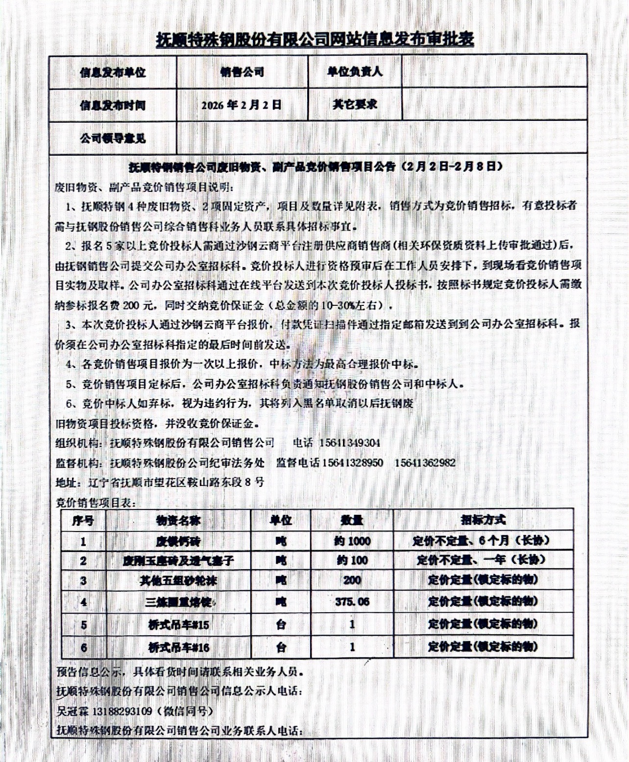撫順特鋼銷售公司廢舊物資、副產(chǎn)品競(jìng)價(jià)銷售項(xiàng)目公告(2月2日-2月8日)